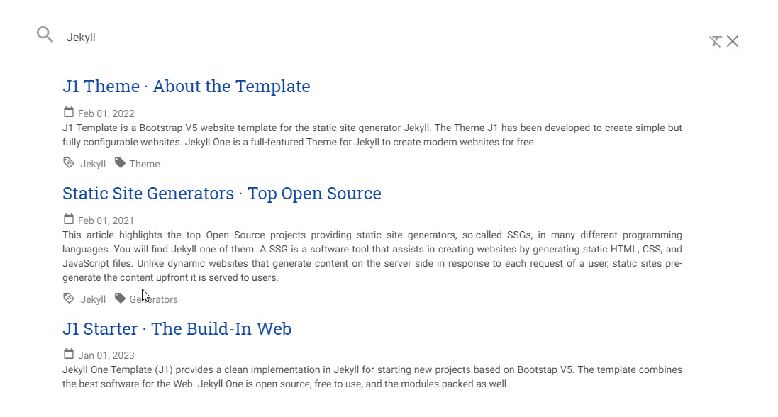 jekyllThe above will return all documents that match the term jekyll. Searches for multiple terms (words) are also supported. If a document matches at least one of the search terms, it will show in the results. The search terms are combined by an logical OR.